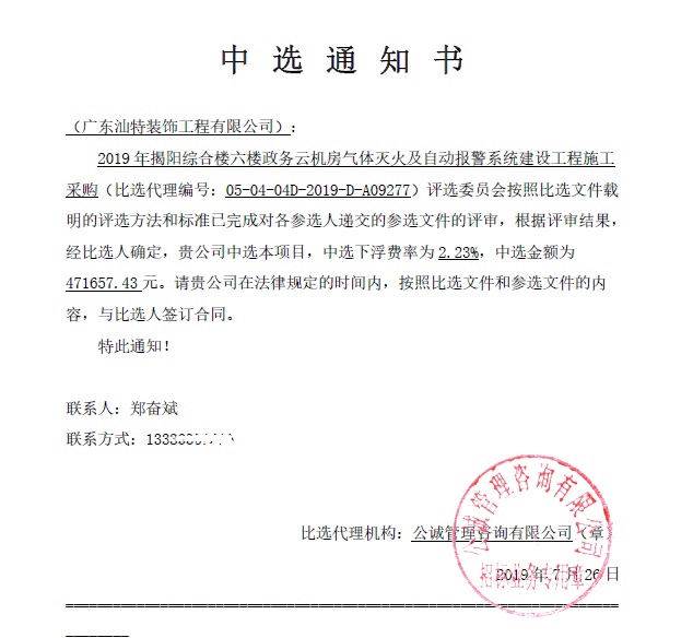 汕特又双叒叕中标! 分享到: 发布日期:2019-08-01点击次数:2588 7月,骄阳似火,喜讯频传,汕特又双叒叕中标了! 在公司全体人员的不懈努力下,广东汕特装饰工程有限公司再次以绝对优势成功中标,中选“2019 年揭阳综合楼六楼政务云机房气体灭火及自动报警系统建设工程施工采购”项目。 每一次中标对公司来说都是莫大的荣誉,也是一次又一次的考验。汕特定将不负所望,也不负自己,匠心前行,一步一脚印,缔造精品工程。