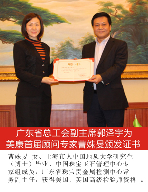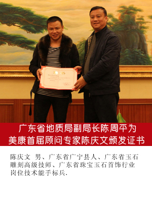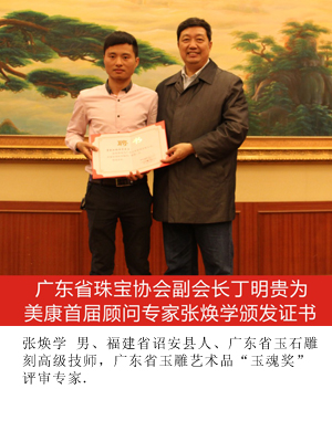 为鼓励优秀珠宝玉器首饰设计人才不断进取,展示中国珠宝玉器首饰文化的独特魅力和设计不俗的实力,促进具有时代精神珠宝文化的创新与发展,在省珠宝玉石首饰行业协会的积极推动和组织下,2014年1月11日美康玉器首届顾问团聘任仪式在广州市隆重举行,会议由省珠宝协会秘书长主持。省地质局、省总工会、省珠宝玉器协会等单位相关领导出席了此次仪式。