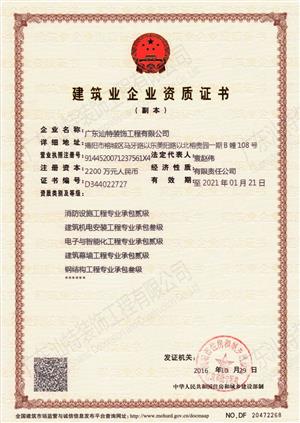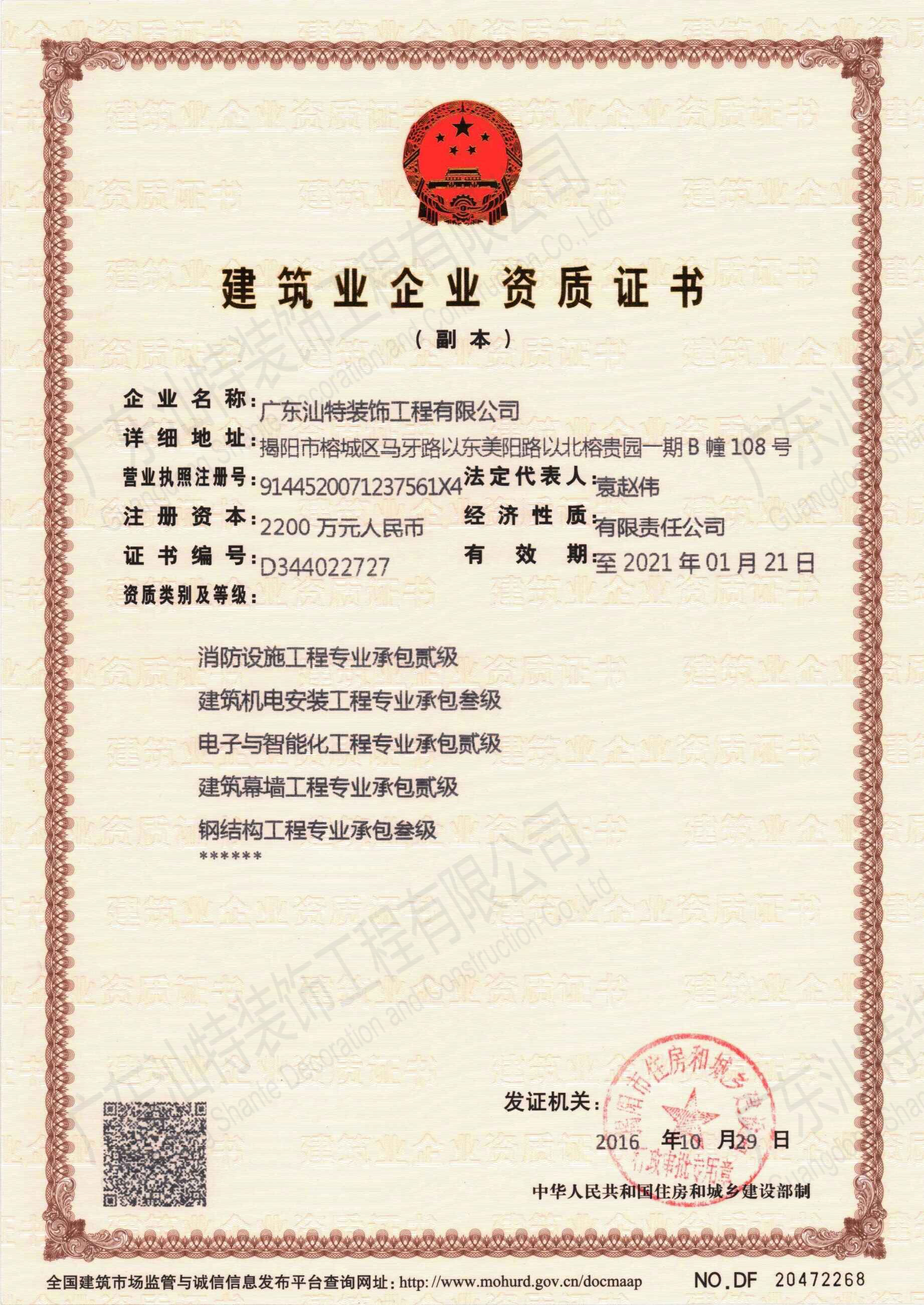 广东汕特装饰工程有限公司建筑业企业资质证书