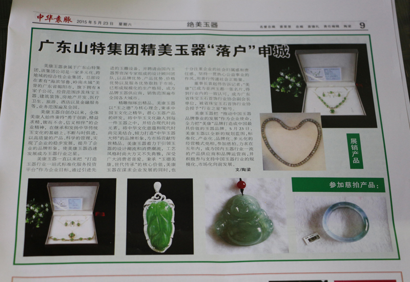 广东山特集团为这次拍卖会精心准备了60多套美康品牌的精美玉器,向全国各地的朋友展现了山特的风采与实力。广东山特集团在向全国各地朋友展示美康品牌玉器的同时,也用实际行动把“玉德美康,世代传承”的核心价值传播给各界朋友,愿与社会各界携手关注弱势群体,共同倾注爱心。在慈拍会上,广东山特集团赞助了高档玉器,并把拍卖款项捐赠出,用于助学救危。在玉文化交流会上,广东山特集团也担当起玉文化的传播使者,践行着推动中国玉器品牌事业发展的企业使命,与各界朋友一起真诚交流探讨中华玉文化,积极弘扬中华博大精深的玉文化,共同做玉文化的传播者与践行者。