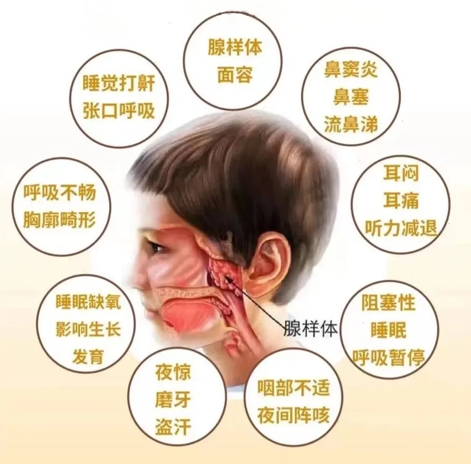腺样体面容,睡觉出现打鼾、憋气,在睡眠中可以出现缺氧,影响身体发育的;