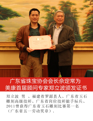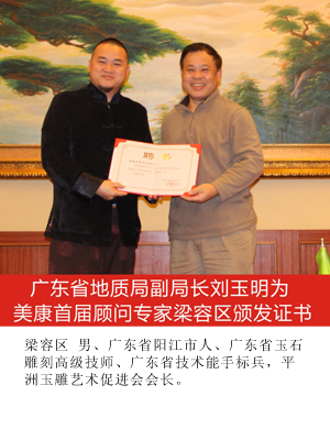 为鼓励优秀珠宝玉器首饰设计人才不断进取,展示中国珠宝玉器首饰文化的独特魅力和设计不俗的实力,促进具有时代精神珠宝文化的创新与发展,在省珠宝玉石首饰行业协会的积极推动和组织下,2014年1月11日美康玉器首届顾问团聘任仪式在广州市隆重举行,会议由省珠宝协会秘书长主持。省地质局、省总工会、省珠宝玉器协会等单位相关领导出席了此次仪式。