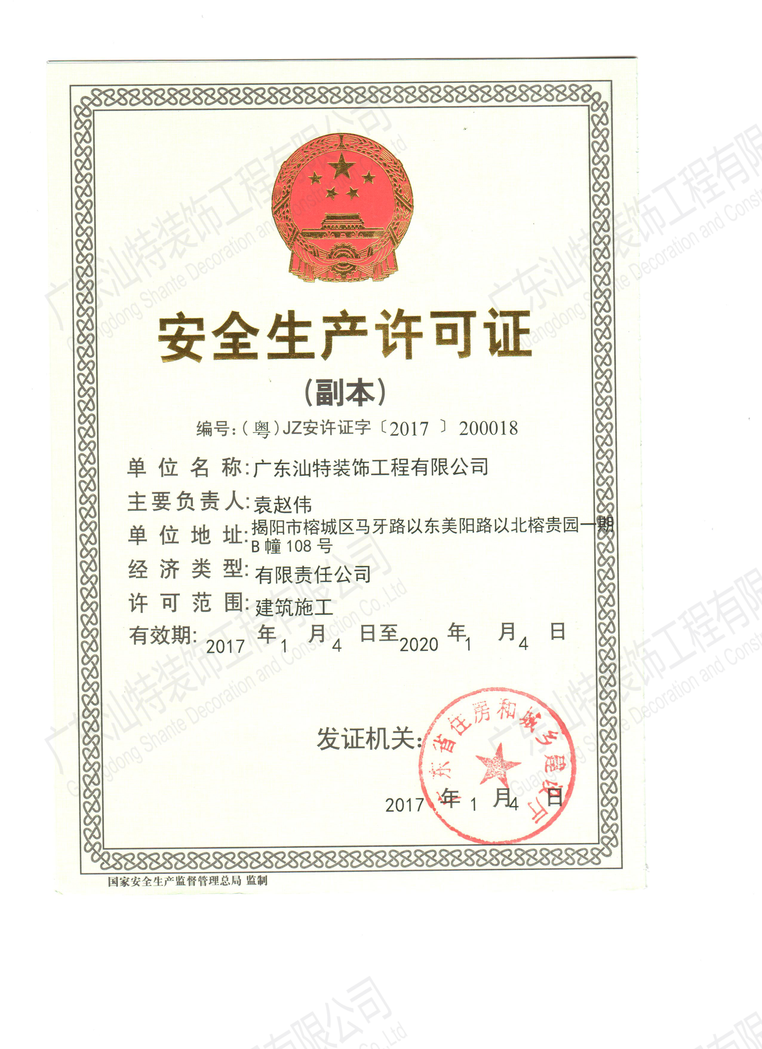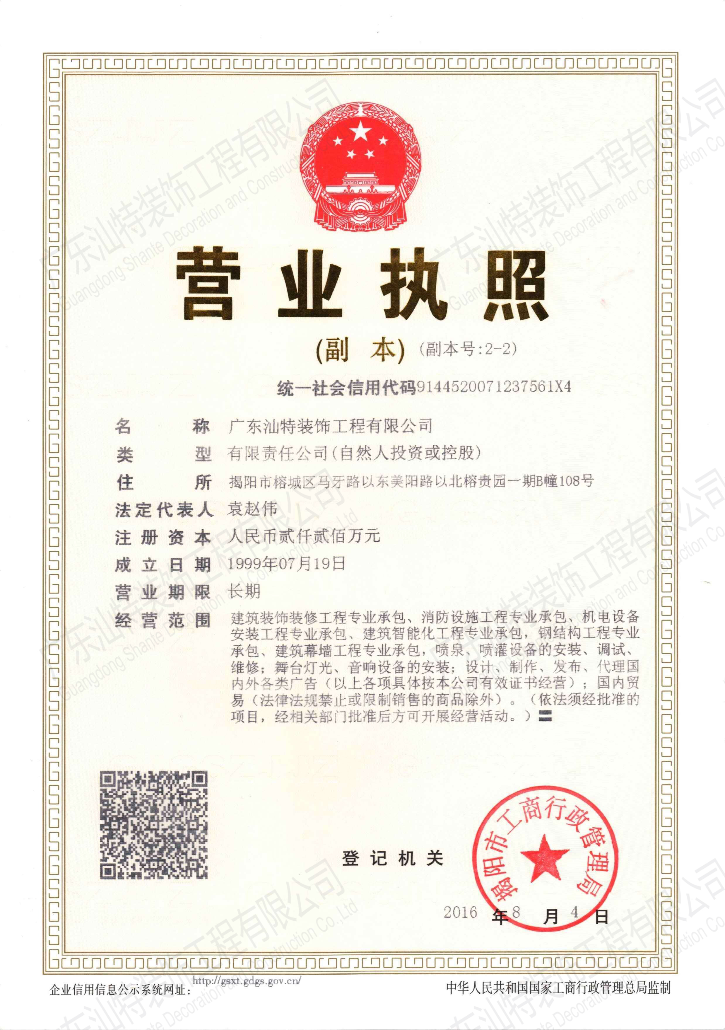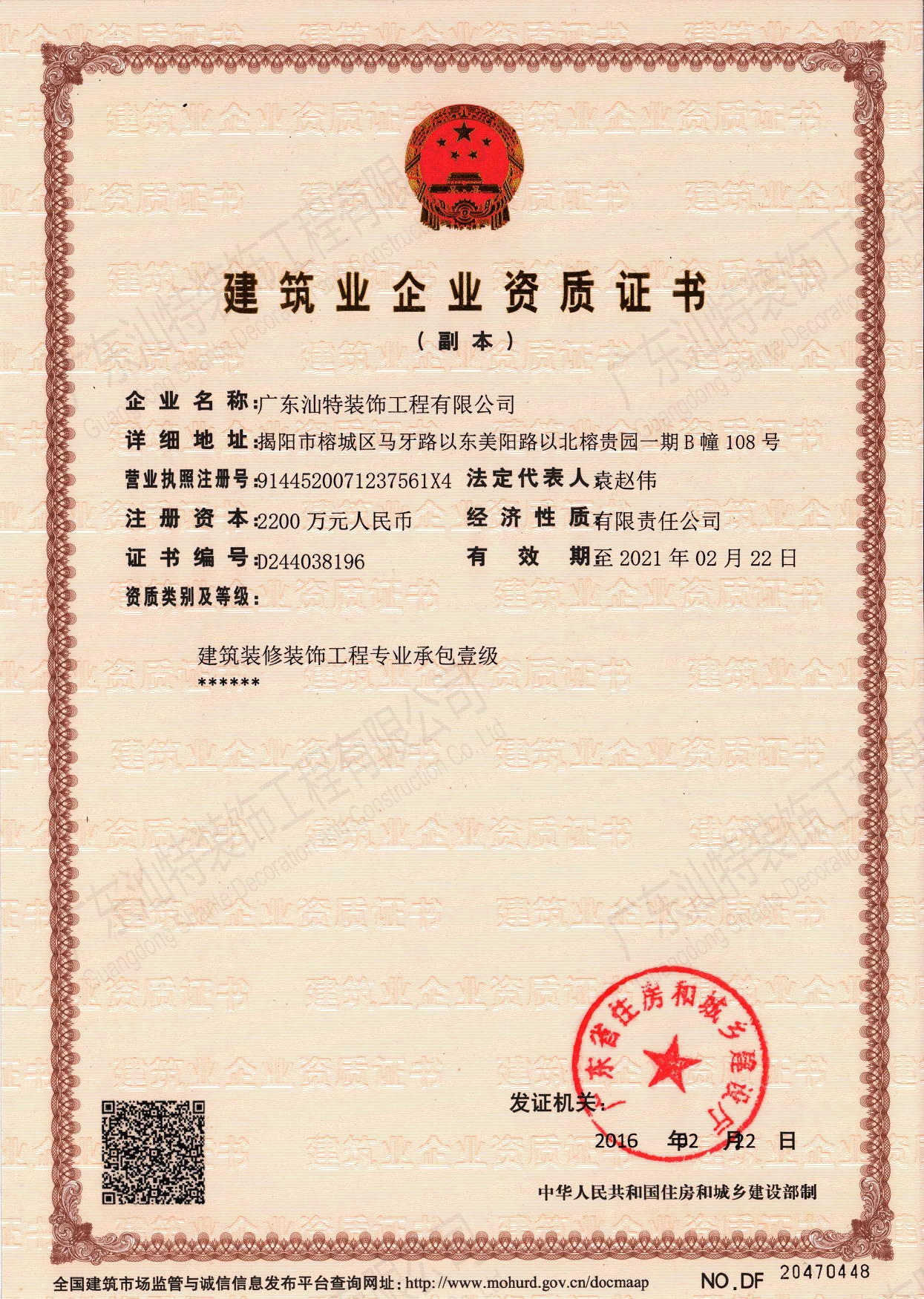 广东汕特装饰工程有限公司建筑业企业资质证书